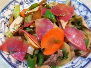 豆干切片;红萝卜去皮切片;青辣椒切小块。