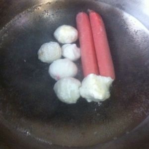 慢慢搅、一直要保持小火、加入鱼丸、搅拌、咖喱整个变黏稠之后、再加半勺奶油、黑胡椒碎、最后加综合香草、搅匀、出锅
