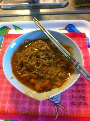 将热好的咖喱从锅中取出,剪开袋子,浇在魔芋丝上,拌匀即可。