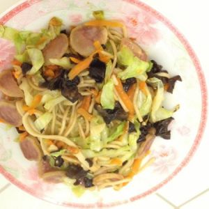 包菜胡萝卜木耳切丝(我木耳时间还有点短所以等到下锅前在切丝)香肠切片。