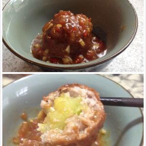 成品,第一口咬下去弹弹的,外酥里嫩,小瓜又粉粉的,沾上酱汁…不说了,大家没事可以试试。我比较偏好酸甜风味,所以都会加点糖醋。