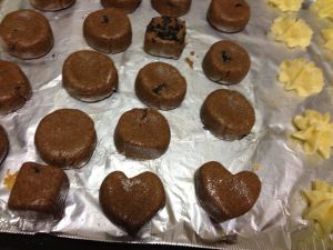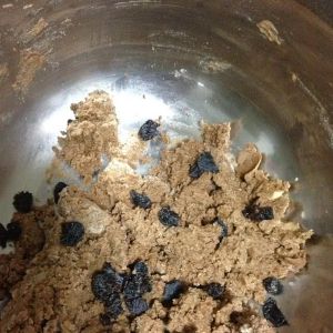 加花生酱、可可粉、熟面粉搅拌均匀,也可加黑提坚果。用手捏成想要的形状