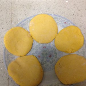 南瓜适量,去皮切块蒸熟。碾成泥后加糖加黄油。放凉后再加糯米粉。切记要凉了之后再操作。