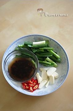 豆豉用清水泡软,蒜切片,蒜苗切段,小红辣椒切碎;