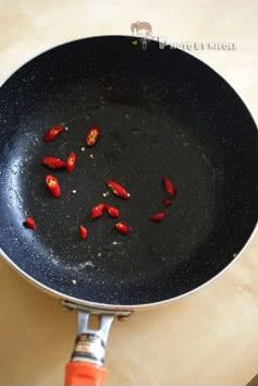 另起锅加入少许油,烧热后放入小红辣椒煸炒;