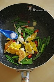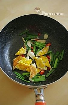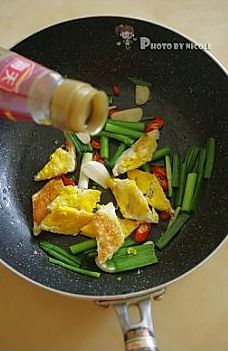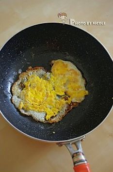迅速翻炒几下后倒入鸡蛋块;
