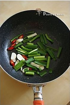 煸出辣味后放入蒜苗和蒜片翻炒;