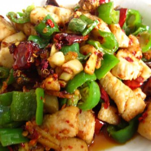 起锅放油,将干辣椒段、姜丝、花椒粒,葱白段一并放入,爆香~再放入青椒段,放入青椒翻炒一分钟,再放入事先炒制过的鸡腿肉以及葱叶翻炒吧~嗯,别忘了加以盐、鸡精调味~