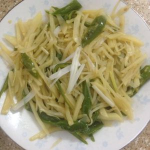 放入杭椒丝翻炒几下 再放入沥干水的土豆丝继续翻炒 炒到杭椒出味 加盐 鸡精 少许水收汁即可