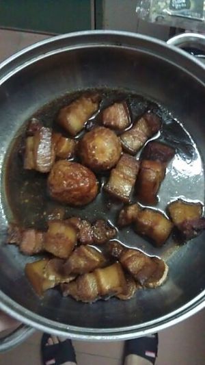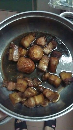 将锅里的油倒掉,可以下次用。将五花肉和蛋放入锅中,加入没过肉的水先大火烧开再小火慢炖,加入姜老抽生抽冰糖适量,炖40分钟。美味的红烧肉就好了。