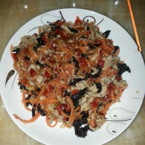 锅放油 姜蒜爆锅 加剁椒炒香 加入胡萝卜和木耳 翻炒三四分钟 加肉丝及碗汁 翻炒一分钟出锅