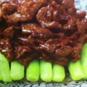 将氽好的芥兰摆盘。锅上汤爆香蒜片,再放入蚝油,牛肉片、烹料酒翻炒,放味精,鸡粉,老抽,勾薄芡出锅。