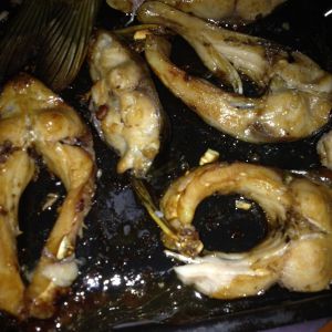 鱼切块,倒入酱油,蒜(切片),姜(切片),适量盐(其实不爱咸可不放)腌制一会,直接入烤箱考就可以了,在烤盘上刷一层油,考至熟就OK,如果想要味道更好,可以撒些孜然,味道顶呱呱!