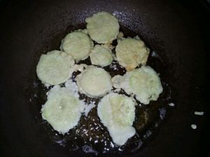 炒锅放入适量的油,将粘过面糊的茄合炸至金黄色,捞出备用