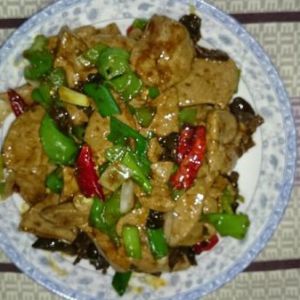 生抽,淀粉,糖,胡椒粉,花椒粉,香油调成料汁。油偏多点,加干辣椒花椒葱段炒香,加入配菜,翻炒,加入肝,老抽,料汁,翻炒至汤汁浓稠即可。
