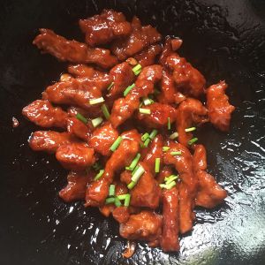 葱、大蒜爆香之后加入番茄酱、开少许醋、糖、酱油(可以依照自己的口味)加水、倒入调好淀粉汁,烧开之后倒入先前炸好的猪里脊翻炒几下即可装盘,最后撒上葱花。