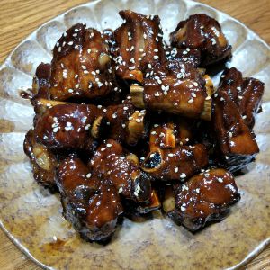 锅中放入少许油,加入葱姜蒜爆香加入排骨翻炒,加入少许酱油翻炒,后加入可乐没过排骨小火炖干,装盘撒上少许芝麻