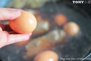 把鸡蛋加入。切忌要改小火,因为大火一烧,鸡蛋很容易爆裂,没有型了!小