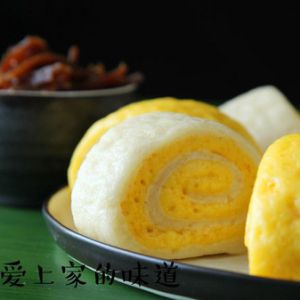 案板撒面摸匀,双色面团分别擀成长方形,分别撒上适量水,将南瓜面片放到白面片上,卷成卷切成均匀大小
