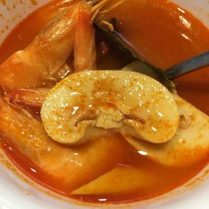 加入口蘑,加鱼露调味。鱼露和冬阴功酱都有咸味,不需要加盐。蘑菇煮2分钟后把虾放进去烧开即可。时间长了虾会老。
