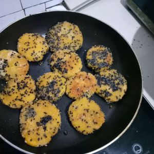 切面团,一个一个的小剂,揉圆,用手按成小饼,放红豆沙,再次揉圆,蘸牛奶,蘸芝麻,蘸面包糠,放平底锅,开煎,熟了啦