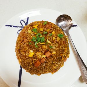 倒入米饭,把米饭压散,加入生抽、老抽、盐些许鸡精(可不放),大火翻炒均匀米饭上色即可出锅