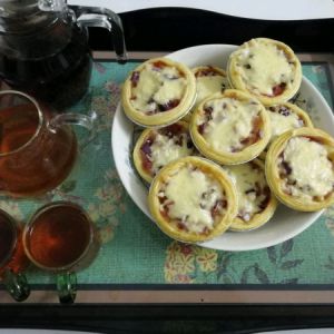 准备材料:蛋挞皮,培根粒,洋葱粒,芝士碎,番茄酱