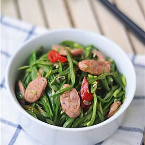 食材准备好,青红椒切片,四季豆切成丝。香肠也切片。