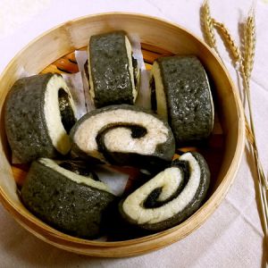 卷到最后不整齐的边切掉,再用两个手轻轻搓长卷起的面团,两头不平整的去掉,用刮刀切成大小合适的刀切馒头,下面垫好油纸码入蒸笼。