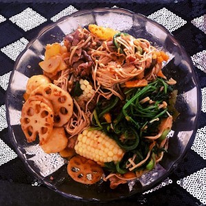 待食材熟至七八分,将香菜和油麦菜放入一起煮