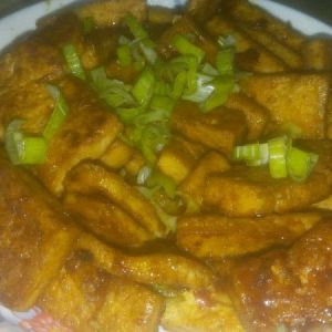 把豆瓣酱倒进去炒一下,小火炒,没有油的话提前加一点油。然后倒入搅拌好的酱汁,就是老抽啊啥的那些。然后倒入豆腐大伙收汁。临出锅前撒葱花,这里葱花点缀用,真正的葱味是葱油煎豆腐。