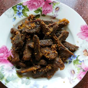 放入烧烤料,韩国糖稀(淘宝有卖瓶装),孜然,芝麻。无糖稀可不放,想要甜的可以在油锅里化开冰糖。