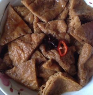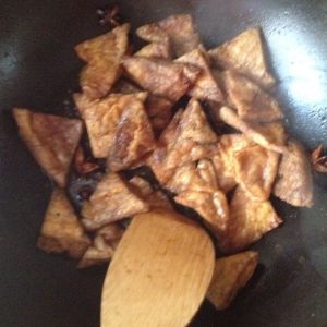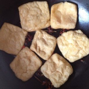 锅中入油,热后开小火下八角、辣椒、葱段、花椒2.一小会后下素鸡煎,持续小火,2面微煎