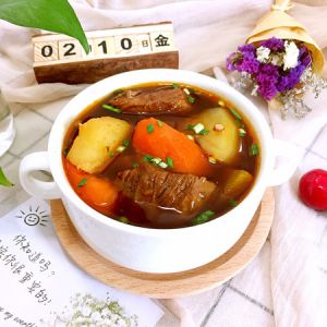 倒掉煮土豆胡萝卜的水,倒入炖好的牛肉连汤,一起煮至土豆胡萝卜都熟烂