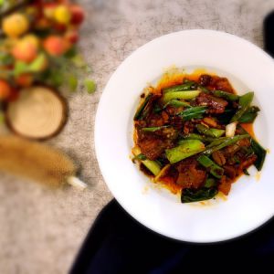 将五花肉的油煸干,肉片炒至微黄倒入郫县豆瓣酱、蒜片、姜片
