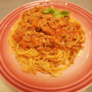 把前面煮好的意面拿出来放入锅内一起炒,炒的时候把肉酱和面均匀混合。