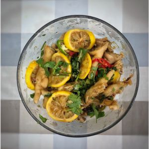 将备好的材料一起放入容器中……蒜末、香菜、柠檬、生抽老抽盐糖醋……等放入搅拌均匀!放置冰箱冷藏……一份简单易做的柠檬鸡爪就完成了!
