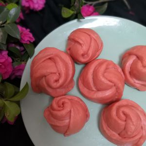 取5份小面团,擀成饺子皮,依次叠好,用筷子放入中间,从底部卷起。做成玫瑰花的样子。