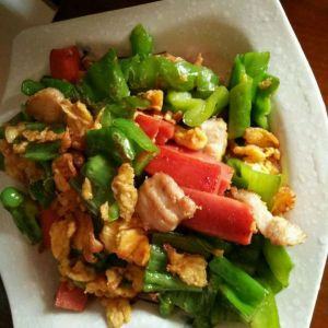 先把鸡蛋煎好盛出备用,再把五花肉炒出猪油,盛出,锅中留猪油再炒青椒
