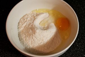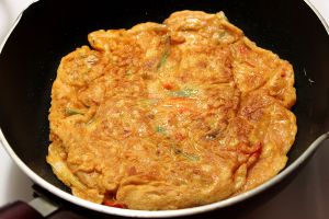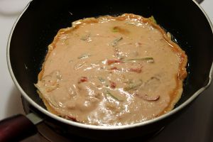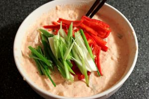 面糊中加少许盐,并根据个人口味加入韩国辣酱,加入切好的泡菜,葱丝,以及各种时令蔬菜。由于家里没菜了我只加了红椒,除此之外还可以加洋葱,胡萝卜,韭菜等