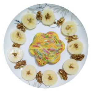 食材:彩色果蔬面、鸡蛋、虾、盐、玉米油;早餐吃搭配牛奶、坚果、水果
