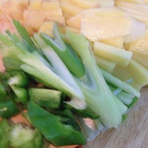 土豆切片,葱切丝,辣椒切丝