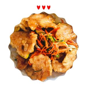调好的料汁 熬起泡 放出炸好的里脊肉 还有配菜 颠勺出锅即可♥️