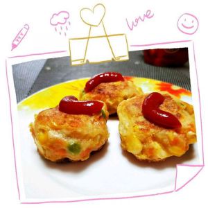 混合食材团成饼,沾鸡蛋液,锅内少许油,煎直两面金黄,摆盘挤上番茄酱