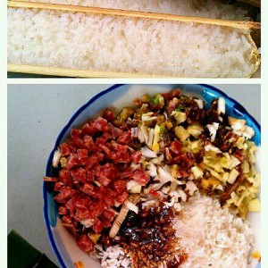 大米加酱油糖浸泡二小时软化膨胀,加上香菇腊肉竹笋茭白等辅料拌匀,品种不限,觉得什么好吃放什么,竹筒锯下一段,一段封闭,另一端凿个小孔,将配料米饭填满890%空间,加水满至满,用锡纸和葡萄酒瓶的软木塞堵住洞口,放入烤箱220度高温双面烧烤,估计30-45分钟烤至竹香四溢,表面焦黄取出,用刀劈开上桌即成,喜欢吃甜的,只有白米中加糖即可
