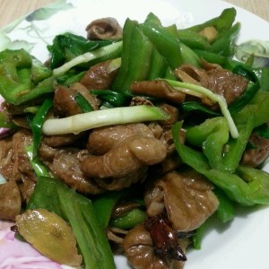 倒入青椒继续翻炒,这时加少许生抽和盐调味