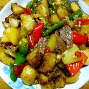 锅中放油先炒牛肉,稍稍炒一会铲出来,再下辣椒、蒜头、盐、鸡精、糖、醋、再下刚刚炸好的茄子、土豆、放少许水炒匀即可出锅。