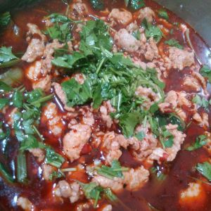 锅上热油,将豆瓣酱炒香放入火锅料炒至融化,锅内加水,放入少量盐提味,待水开后放入肉片,3到5分钟后出锅,倒入铺好油菜的盆里,撒上香菜即可