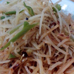 放入土豆丝。翻炒熟透。不会切的可以去外面买切好的。我就是在外面买的。