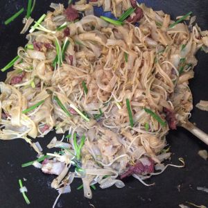 河粉炒至表面金黄色后加入刚刚炒好的牛肉片,继续翻炒几下……随即加入酱油炒均匀,上碟前下点葱段,翻炒几下即可上碟食用。